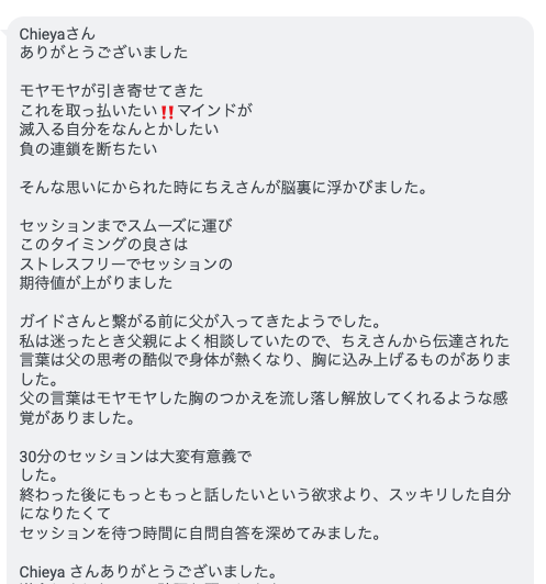 Chieyaさん ありがとうございました モヤモヤが引き寄せてきた これを取っ払いたい‼️マインドが 滅入る自分をなんとかしたい 負の連鎖を断ちたい そんな思いにかられた時にちえさんが脳裏に浮かびました。 セッションまでスムーズに運び このタイミングの良さは ストレスフリーでセッションの 期待値が上がりました ガイドさんと繋がる前に父が入ってきたようでした。 私は迷ったとき父親によく相談していたので、ちえさんから伝達された言葉は父の思考の酷似で身体が熱くなり、胸に込み上げるものがありました。 父の言葉はモヤモヤした胸のつかえを流し落し解放してくれるような感覚がありました。 30分のセッションは大変有意義で した。 終わった後にもっともっと話したいという欲求より、スッキリした自分になりたくて セッションを待つ時間に自問自答を深めてみました。 Chieya さんありがとうございました。