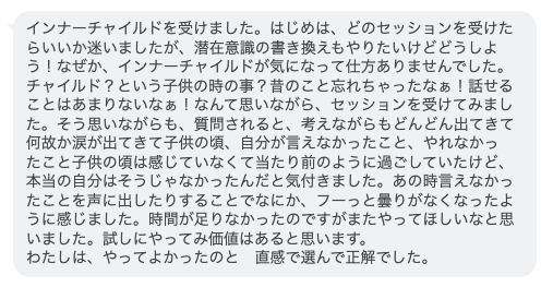 インナーチャイルドを受けました。はじめは、どのセッションを受けたらいいか迷いましたが、潜在意識の書き換えもやりたいけどどうしよう!なぜか、インナーチャイルドが気になって仕方ありませんでした。チャイルド?という子供の時の事?昔のこと忘れちゃったなぁ!話せることはあまりないなぁ!なんて思いながら、セッションを受けてみました。そう思いながらも、質問されると、考えながらもどんどん出てきて何故か涙が出てきて子供の頃、自分が言えなかったこと、やれなかっ たこと子供の頃は感じていなくて当たり前のように過ごしていたけど、本当の自分はそうじゃなかったんだと気付きました。あの時言えなかったことを声に出したりすることでなにか、フーっと曇りがなくなったように感じました。時間が足りなかったのですがまたやってほしいなと思いました。試しにやってみ価値はあると思います。