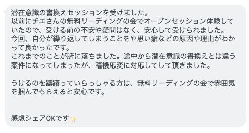 以前にチエさんの無料リーディングの会でオープンセッション体験していたので、受ける前の不安や疑問はなく、安心して受けられました。